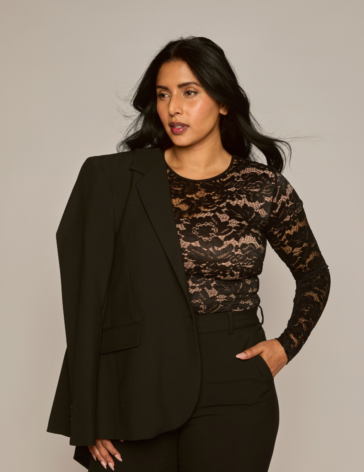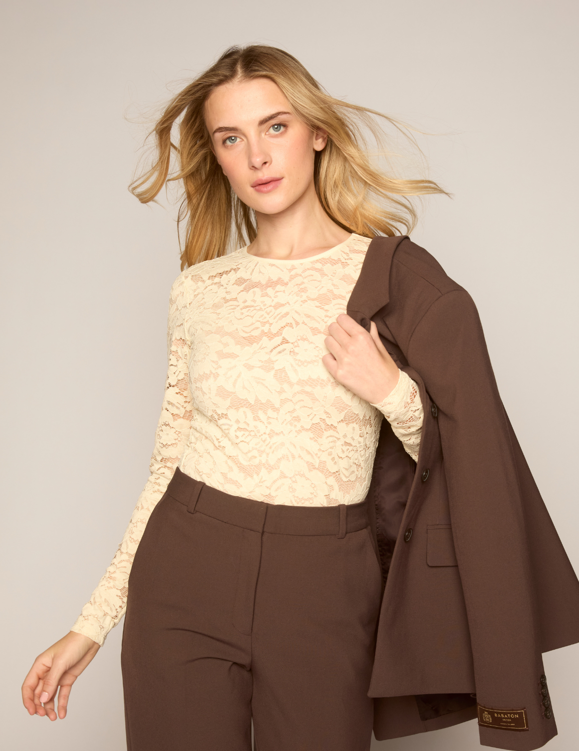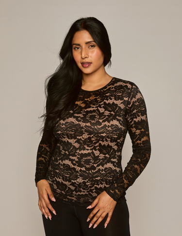 The Lace Overlay: A statement-making piece that blends elegance with versatility. Crafted from a lightweight, breathable sheer lace knit, it’s the ultimate outfit transformer for the season. Whether styled for an elevated evening look or paired with denim for casual charm, this long-sleeve top adds a touch of romance and drama to any wardrobe. Designed for easy care, easy wear.