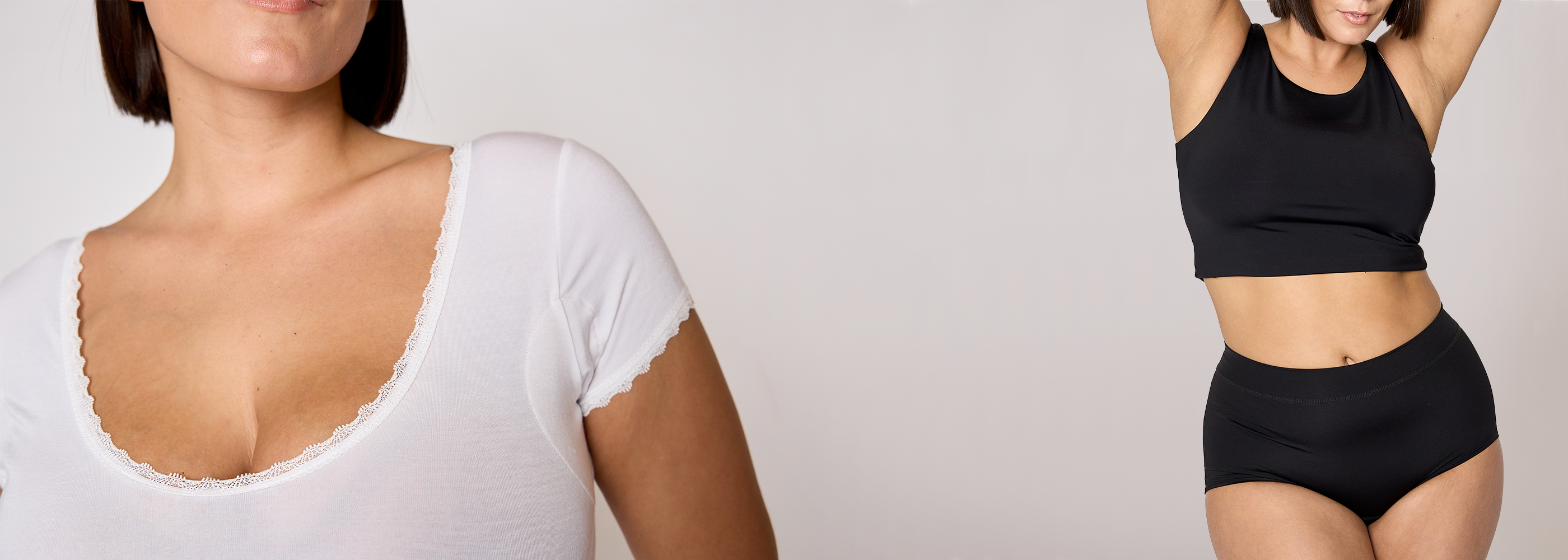 "Suddenly sweating through tops? Add a base layer that wicks away sweat and odor. Numi’s signature undershirt is made from a thermoregulating fabric that is soft and cool against skin. The best part: absorbent underarm shields that prevent embarrassing sweat stains, so you feel fresh all day."